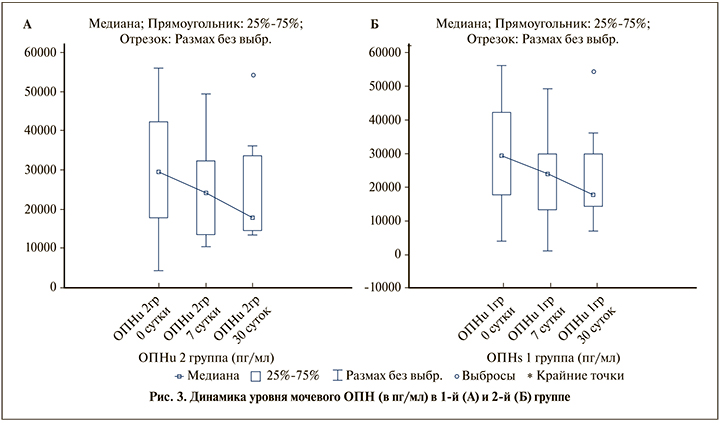 В 1-й группе отмечено повышение уровня сывороточного ОПН к 7-м и 30-м суткам, различия достоверны (р≤0,05) (рис. 2А). Во 2-й группе отмечено увеличение уровня сыворочного ОПН к 7-м суткам (р≤0,05) с дальнейшим незначимым нарастанием (р>0,05) (рис. 2Б).