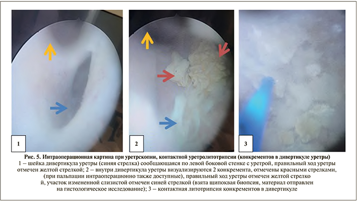 Во время диагностической уретроскопии: дистальная часть пенильного отдела уретры не изменена. В проксимальной части пенильного отдела уретры (в пеноскротальной области) определяется дивертикул уретры, сообщающийся по левой боковой стенке уретры (рис. 5). Вход в дивертикул представлен дефектом левой боковой стенки уретры на протяжении 3 см. В полости дивертикула отмечаются ворсинчатые разрастания стенки и два конкремента 0,8 и 1,5 см в диаметре. Выполнена щипковая биопсия слизистой дивертикула, контактная литотрипсия конкрементов. Конкременты фрагментированы и удалены.