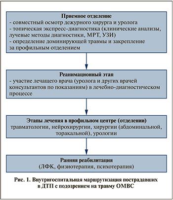 Результаты. При анализе результатов лечения установлено, что в начальном периоде работы на догоспитальном этапе не были диагностированы повреждения ОМВС в сочетании с переломами костей у 17,3% пострадавших, травмой органов груди – у 11,3%, живота (3,0%), головы (5,6%). Их основная причина – объективные трудности диагностики из-за доминирования травм других локализаций. Было принято решение о необходимости выполнения при поступлении всем пострадавшим топической экспресс-диагностики (КТ, УЗИ, рентгенологические, лабораторные исследования), а также при включении в многопрофильную бригаду по сочетанной травме врача-уролога.