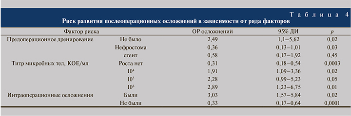 По мере увеличения титра микробных тел в моче возрастал риск развития послеоперационных осложнений. Так, при титре микробных тел 106 КОЕ/мл риск развития послеоперационных осложнений был более чем в 2,5 раза выше, чем в отсутствие роста микрофлоры (р=0,01). Послеоперационные осложнения наблюдались в 3 раза чаще (р=0,02) у пациентов с интраоперационными осложнениями. По всей видимости, данный факт связан с интраоперационными осложнениями травматического характера, которые в последующем могут приводить к формированию стриктуры (облитерации) мочеточника (табл. 4).