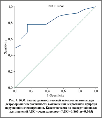 Как показал ROC-анализ (рис. 4), амплитуда повышения внутрипузырного давления в момент непроизвольного сокращения имеет высокую предсказательную способность в отношении нейрогенной природы гиперактивности вне зависимости от неврологического диагноза (AUC=0,863; p=0,045). Детрузорное давление более 9,5 см Н20 имеет чувствительность, равную 88%, относительно нейрогенного характера нарушений. Специфичность при этом низкая и равна 54%.