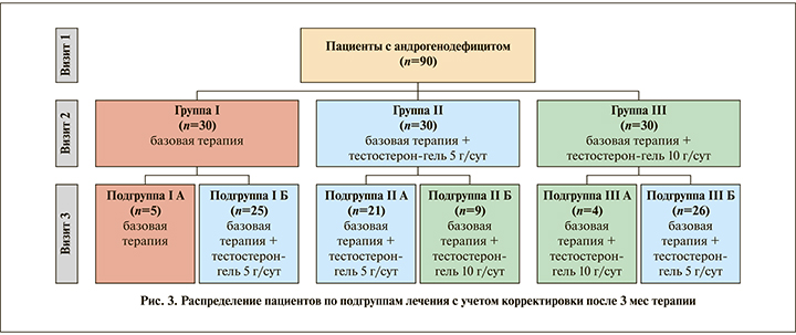 В подгруппе IIIА (n=4) пациенты продолжили получать базовую терапию в сочетании с тестостерон-гелем в дозе 10 г (2 саше) однократно утром, так как изменения показателей у них была менее выражены. Исходный уровень тестостерона был меньше 6 нмоль/л, а динамика его прироста не позволила достичь нормальных значений за 3 мес. терапии.