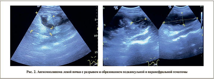 При УЗИ определены множественные ангиомиолипомы почек, подкапсульная и парнефральная гематомы слева (рис. 2).