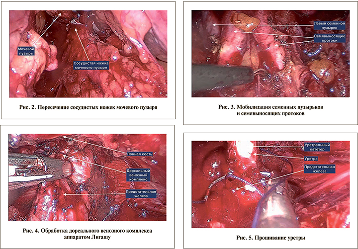Заключение. Лапароскопическая радикальная цистэктомия с поздним пересечением мочеточников позволяет предотвращать длительный контакт брюшины с гиперосмолярной и не всегда стерильной мочой, тем самым существенно уменьшать факторы воспаления и вероятность развития склеротических изменений и спаечного процесса в брюшной полости.