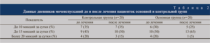 Выраженность дизурии отражалась пациентками в дневниках мочеиспусканий, которые они вели на протяжении 2 сут. с момента начала и за 2 сут. до окончания курса лечения (табл. 2).