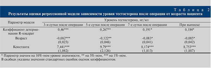Расчет коэффициентов парной линейной корреляции (табл. 1) между уровнем тестостерона и возрастом пациентов выявил статистически значимое (p<0,05) снижение уровня тестостерона на 3-и, 5, 7 и 14-е сутки после операции, т.е. чем старше пациент, тем статистически значимо медленнее восстанавливается уровень тестостерона после операции. Путем оценки моделей парной линейного регресса (табл. 2) установлено, что влияние возраста на уровень тестостерона снижается при увеличении времени после операции, хотя количественное снижение уровня тестостерона остается практически одинаковым.