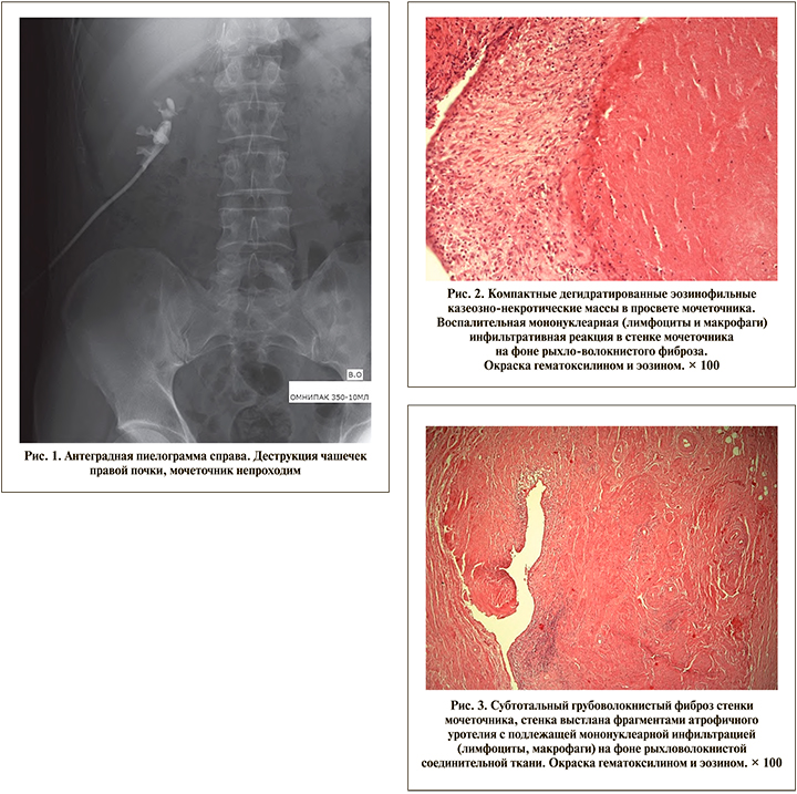 Следует подчеркнуть отличную настороженность в данном случае урологов общей лечебной сети – они своевременно (насколько это возможно в конкретном примере) заподозрили туберкулез и направили пациента фтизиатрам. Почти три четверти пациентов с туберкулезом мочеточника имеют стриктуру в нижней трети («излюбленное место» туберкулеза), вероятно, именно поэтому на первом этапе пациенту был выставлен диагноз «стриктура нижней трети правого мочеточника». Более глубокое обследование в условиях ФГБУ показало непроходимость мочеточника на всем протяжении. Современная противотуберкулезная полихимиотерапия позволяет излечивать выявленный на ранней стадии УГТ консервативно. Туберкулез мочевыводящих путей, как правило, нельзя вылечить без последствий в силу формирования на месте воспаления рубцов, как правило, грубых и деформирующих [6]. По образному выражению В.Д. Грунда [7], при нефротуберкулезе мы получаем желательное рубцевание в нежелательном месте, ибо любой рубец суть стриктура, нарушающая уродинамику и возможна гибель уже излеченной от туберкулеза почки из-за облитерации мочеточника.