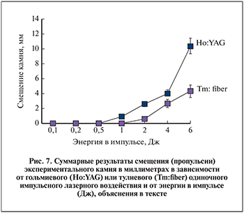 Результаты и обсуждение. Результаты экспериментального исследования смещения искусственного камня в ответ на одиночное импульсное воздействие Ho:YAG и Tm:fiber лазеров при различной энергии воздействия представлены на рис. 7. Как видно из графика, пропульсия искусственного камня при волоконной тулиевой литотрипсии значительно меньше, чем при гольмиевой литотрипсии, даже при высокомощностном воздействии, а при лечебных параметрах Tm:fiber литотрипсии (1,0–1,5 Дж) камень практически не смещается.