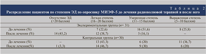В экспериментальной группе до лечения распределение по степеням ЭД, согласно опроснику МИЭФ-5, следующее: легкая степень — 7 (22,6%) пациентов, умеренная степень - 16 (51,6%), выраженная степень - 8 (25,8%). В группе контроля распределение по степеням: легкая степень - 13 (43,3%) пациентов, умеренная степень - 6 (20%), выраженная степень - 11 (36,7%) (табл. 2).