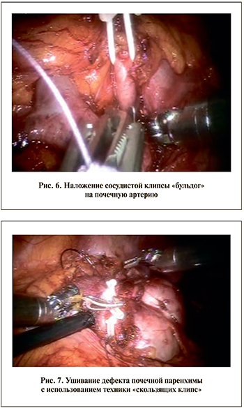 Согласно данным обзора литературы по вопросу интраоперационной ишемии почки [13], безопасный период тепловой ишемии ограничивается 20 мин. В настоящее время существует несколько техник, направленных на минимизацию вредного воздействия тепловой ишемии. Одна из них заключается в раннем снятии сосудистого зажима (early-unclamping). При этом зажим снимают после удаления опухоли и наложения первого ряда швов на дефект паренхимы. В работе, посвященной данной технике [14], авторы продемонстрировали уменьшение времени тепловой ишемии с 22,3 до 16,7 мин в когорте 430 пациентов (p<0,0001). При этом кровопотеря была больше в группе раннего снятия зажима (369 против 240 мл, p=0,001). Другая эволюционная техника, так называемая новая зеро-ишемия, подробно описана I. S. Gill et al. [15]. Она представляет собой селективную микродиссекцию ветви почечной артерии 3-го или 4-го порядка, кровоснабжающую непосредственно опухоль, в условиях интраоперационной контролируемой артериальной гипотензии.