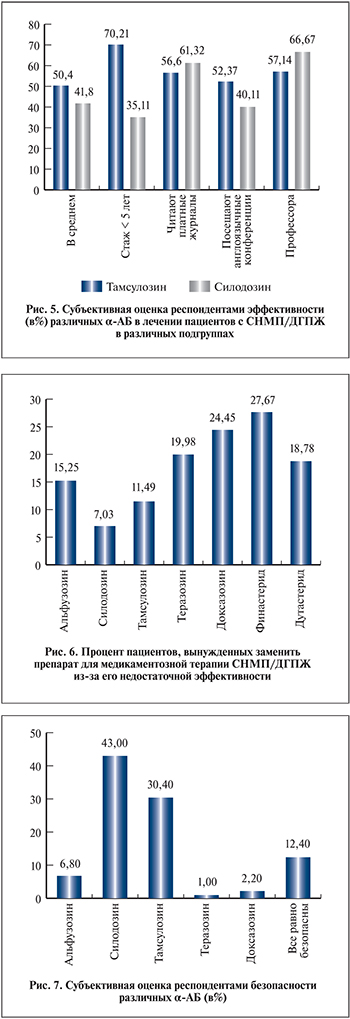 Анализ в подгруппах выявил, что среди профессоров субъективная оценка безопасности силодозина оказалась самой высокой – 71,43%. Почти так же ответили урологи, активно читающие платные журналы (62,3%) и посещающие международные урологические конференции (59,2%). Их преференции в пользу силодозина оказались заметно выше средних показателей. В то же время специалисты с опытом работы до 5 лет с большим перевесом проголосовали за тамсулозин (70,2%) как за самый безопасный с их точки зрения препарат. Эти данные укрепляют нас в убеждении, что опыт и образование врача имеют исключительное значение в выборе медикаментозной терапии пациентов с СНМП/ДГПЖ.