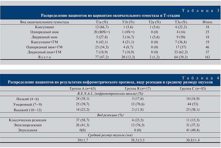 Результаты. Среди 163 прооперированных были 64 (39,3%) женщины и 99 (60,7%) мужчин, их средний возраст составил 56,7±11,1 (25–80) года. Группу А составили пациенты, у которых в качестве временного гемостаза использовали пережатие основного ствола почечного сосуда (n=63), группу B – пережатие сегментарного ствола (n=17) и группу С – пациенты, перенесшие ОСП в условиях нулевой ишемии (n=83). Стадия Т1а диагностирована у 77 пациентов, Т1b – у 20, Т2 – у 2, Т3а – у 64. Распределение пациентов в зависимости от варианта временного и окончательного гемостаза представлено в табл. 2 и 3.